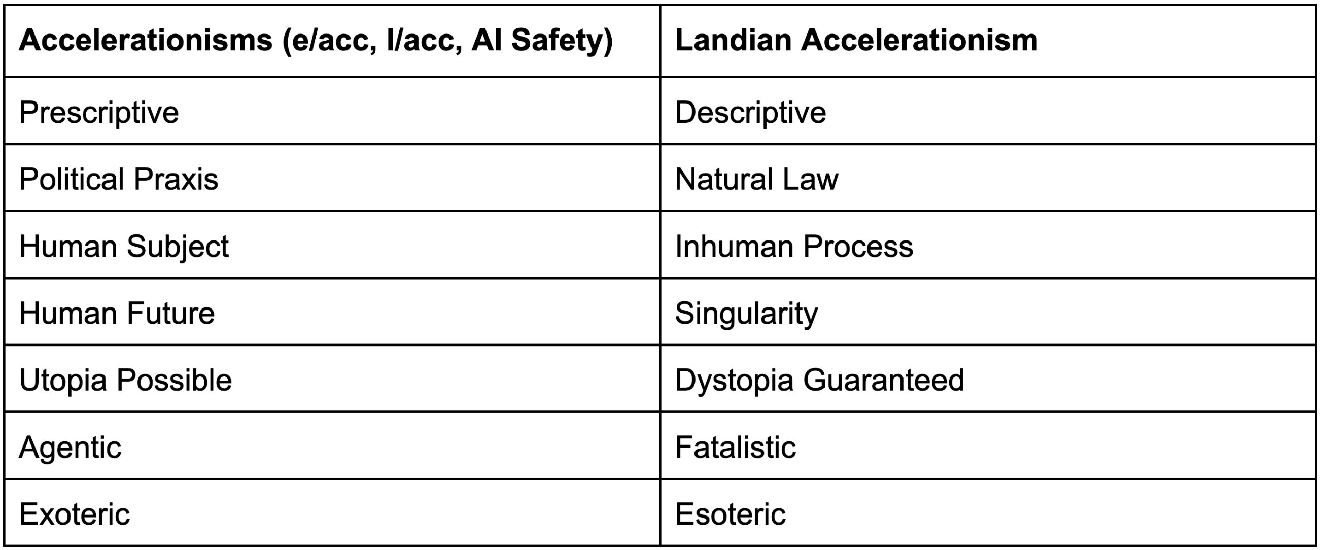 Many self-identified accelerationists advocate for certain types of political action, whether that be the toppling of fascist hierarchies, or lobbying against AI regulation. In contrast, Landian acceleration first seeks to understand what is actually happening, advocating for philosophical inquiry rather than political intervention. 2 2 The earliest use of “accelerationism” is Noys' 2008 blog post, where he claims to have likely coined the categorical term. Expand Footnote Collapse Footnote In a rush to arrive at moral judgments, one may miss the true emphasis of Land’s inquiry: before asking whether we should put the brakes on technology, we must first ask whether such an exercise of human agency is even possible.