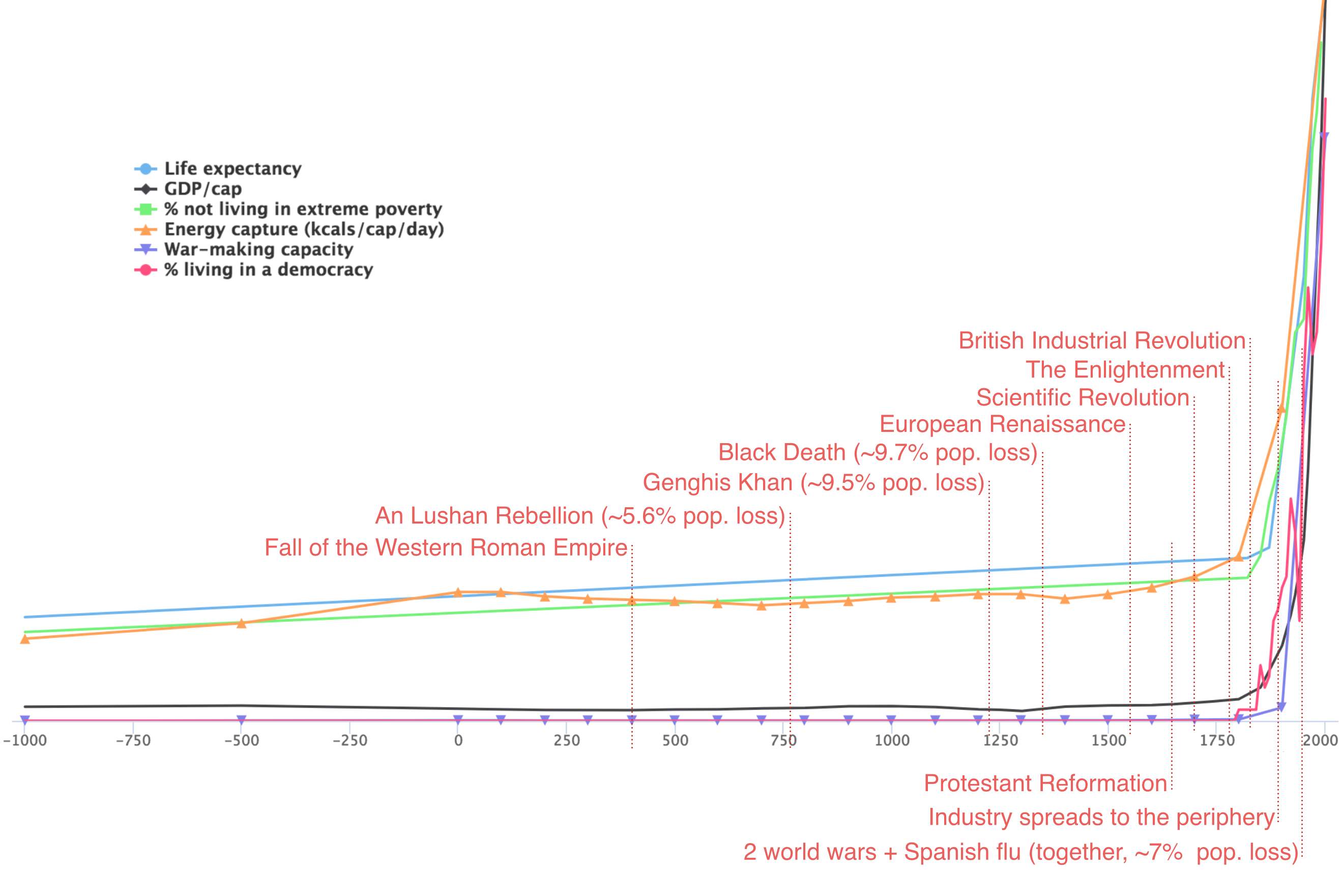 The primary issue distinguishing the various branches of accelerationism is the relationship between humans and the techno-capital system. If the economy is controlled by human beings, not just composed of them, then it is possible to achieve an advanced technological future of human flourishing. 14 14 This is the position taken by l/acc and e/acc, although they differ on what the future looks like and how to get there. AI safety advocates think an AI disaster is very likely, but if it is avoided utopia awaits. Expand Footnote Collapse Footnote The progress studies movement, somewhat adjacent to e/acc, makes a compelling case that technological and economic development since the Industrial Revolution has produced wonders for human well-being. In fact, without continuing growth, humanity will stagnate and eventually decline. Despite the risks of living in a world with nuclear weapons, the upsides of technology have been far greater than the downsides, and this beneficial relationship will continue into the future.