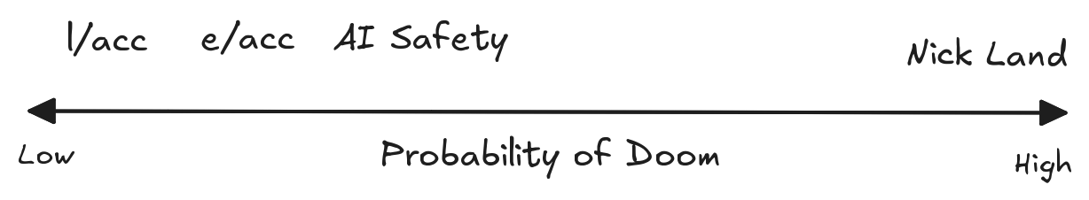 In the following years, various accelerationisms fissioned on Twitter: there were l/acc (left accelerationism), r/acc (right accelerationism), u/acc (unqualified accelerationism), among many others. By the end of the decade the hype had mostly died out, but it was revived in 2022 by e/acc, or effective accelerationism, with “Beff Jezos” leading the charge. 7 7 The name is poking fun at the endless “/acc” distinctions and the Effective Altruism movement. Expand Footnote Collapse Footnote Unlike previous factions, e/acc is supported by more than internet anons, such as venture capitalist Marc Andreessen. In general, e/acc should be understood as a rebranded form of libertarianism. It has explicit political aims and lobbyist groups which aim to prevent government regulation of AI. Those within e/acc believe that the probability of catastrophic risk from AI is low, while the consequences of hobbling it are enormous. According to them, AI and other futuristic technologies are the key to our salvation, enabling a world of abundance. The enemies of e/acc are those who believe that AI poses a grave threat to humanity, and seek to make it safe, whether that be aligning AI with human values or regulating it through government policy. 8 8 For instance, see MIRI and their recent change of focus from technical alignment to lobbying. Expand Footnote Collapse Footnote Those concerned with AI safety (pejoratively called “doomers”) differ from effective accelerationists when it comes to their probability of doom, or “p(doom)”—the likelihood that AI kills us all.
